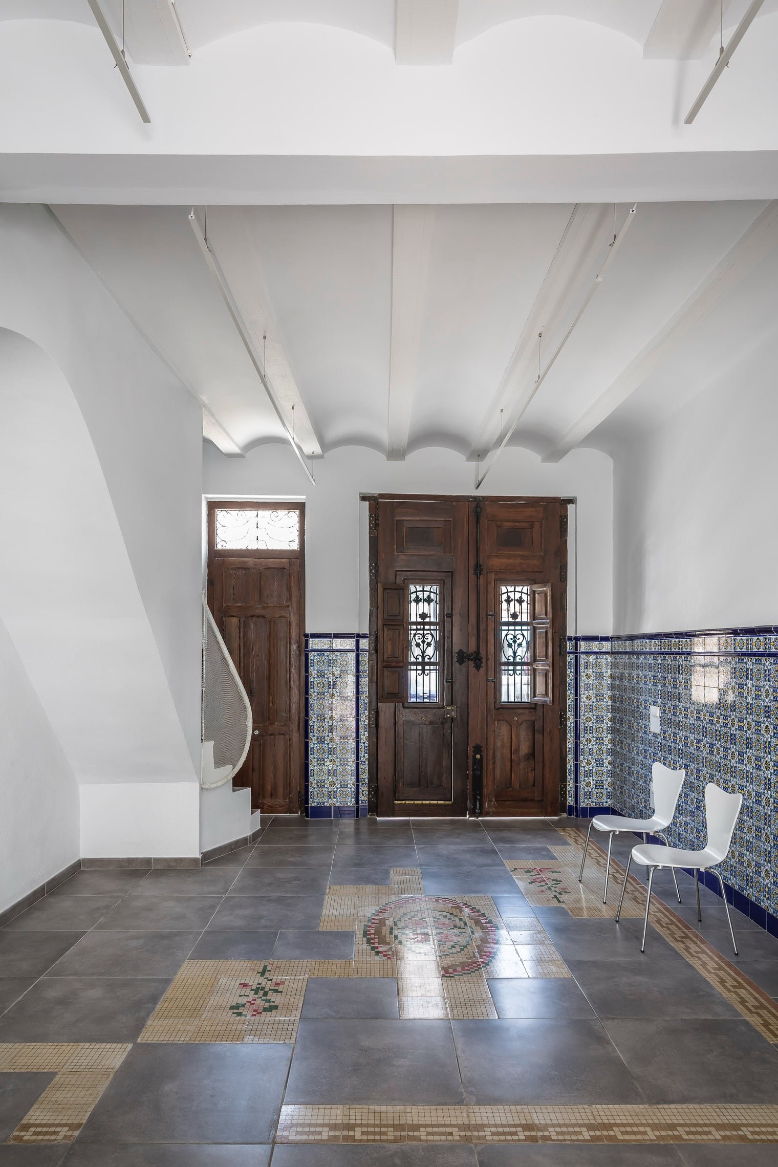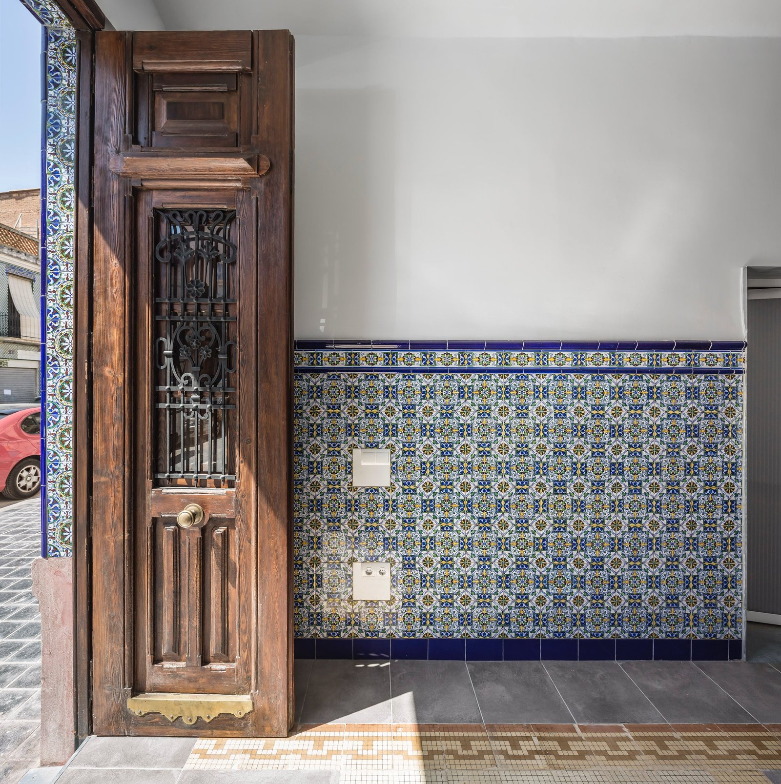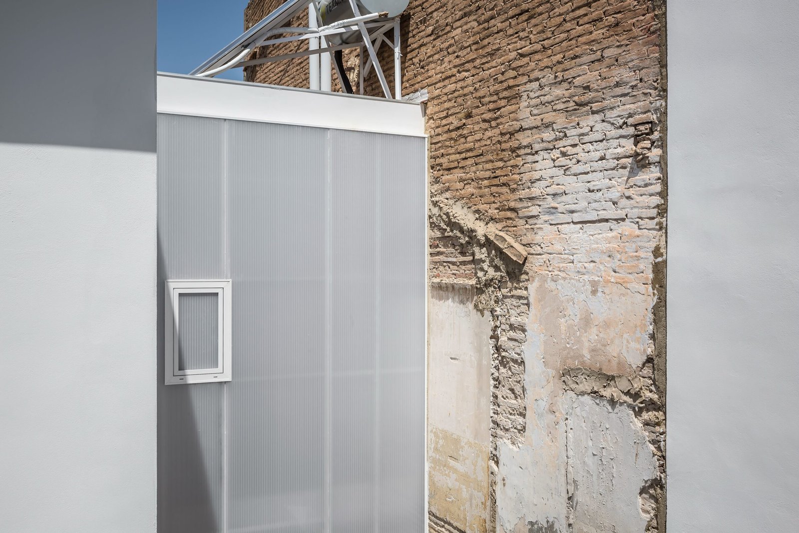 Un dipolo genera energía. Energía para revitalizar. Se limpia la vieja casa, que reluce llena de vida por el día en planta baja y por la noche en planta piso. Los “mecanismos”, el baño, la cocina y sus instalaciones, se anexan en el nuevo volumen joven y prefabricado. Inyectar sistemas constructivos contemporáneos a una trama histórica, dejar caer un prefabricado (dos módulos dominó 3×6) para dotar de instalaciones a una encantadora vivienda de época. Yuxtaponer lo técnico a lo tectónico, el artificio a lo natural, un ámbito de trabajo al de residencia, construcción en seco (a base de acero y paneles de policarbonato) junto a los tradicionales morteros de cal y cubiertas de teja. Construcción ligera (en peso y tiempo), casi industrial, frente a la serenidad atemporal de lo artesanal ¿El factor común? LA CERÁMICA. En la fachada de la parte vieja, se restauran cuidadosamente los tradicionales azulejos valencianos, reluciendo su vidriado original. La fachada de la nueva construcción, se construye con cerámica de última generación: piezas de gran formado colocadas de manera que sus juntas permiten la integración de lo nuevo con lo viejo. La colocación en seco, mediante garras de acero inoxidable, junto a los azulejos agarrados con mortero, subraya la trayectoria temporal de la cerámica, convirtiendo la fachada en un verdadero documento histórico. En el interior, se conservan los paños de zócalo preexistentes. En el pavimento, se recuperan las zonas no deterioradas y se reubican como en un puzle las antiguas baldosas de formato 20×20 entre las nuevas, cerámicas, de 60x60cm.