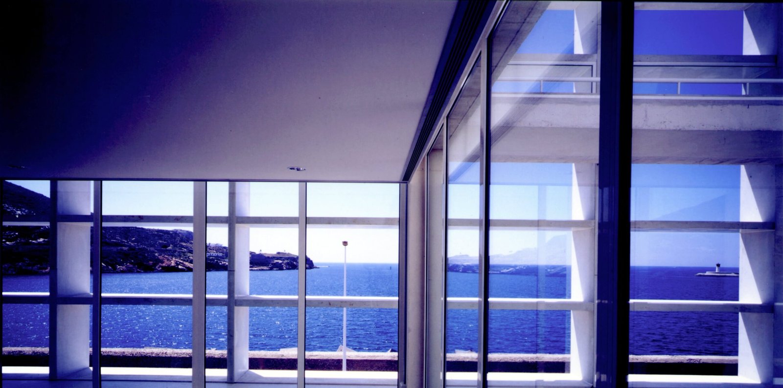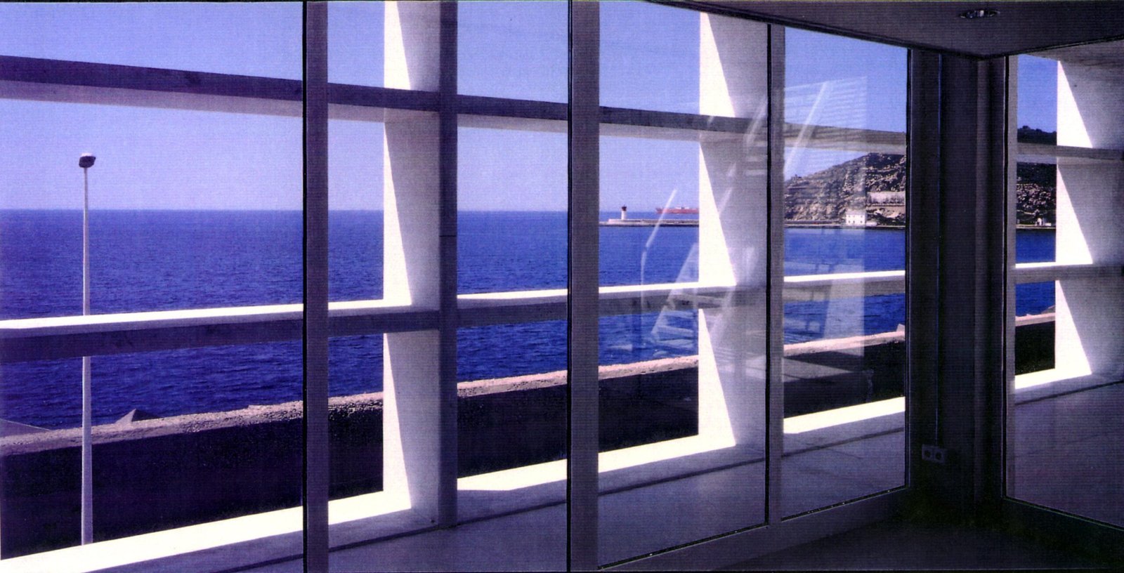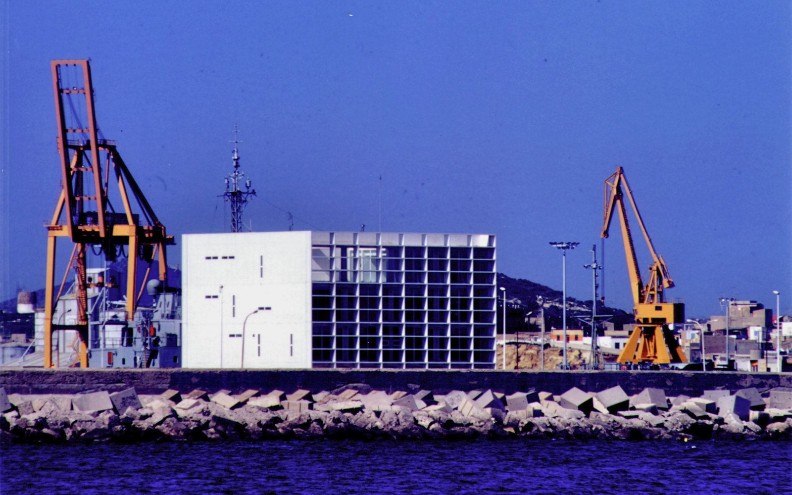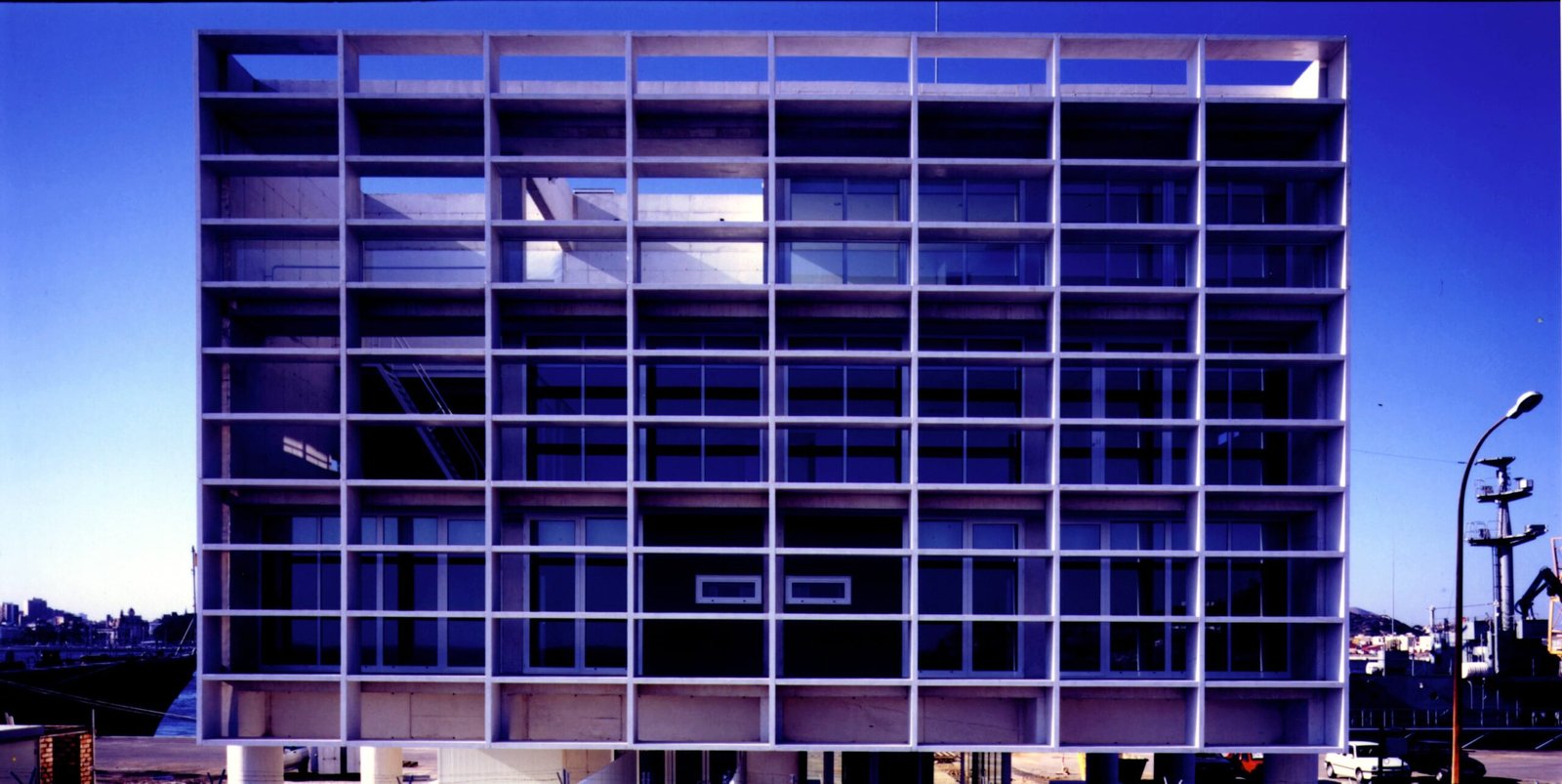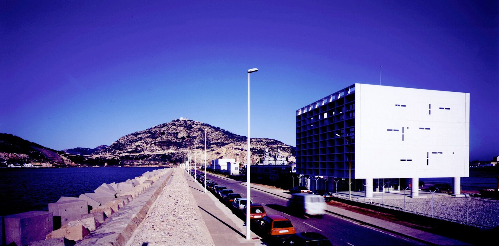 Un cubo sobre el brazo que separa el puerto del mar, un prisma de hormigón blanco 20 x 20 levantado sobre 9 pilotes PI (¢ 1 metro, perímetro p). Seis fachadas en total: cuatro verticales y dos horizontales. Dos caras de vidrio, al norte y al sur, hacia Cartagena y el Mediterráneo, resguardadas por brise-soleils. Las cuatro restantes prácticamente ciegas: las dos verticales lisas, mientras que las dos horizontales aparecen reticuladas.
