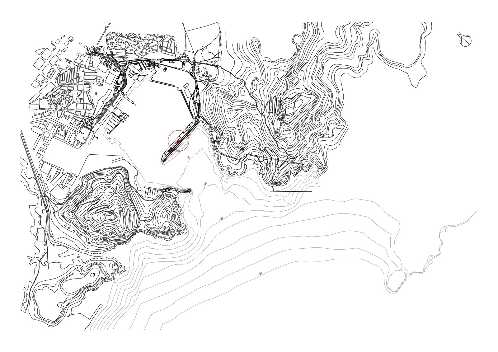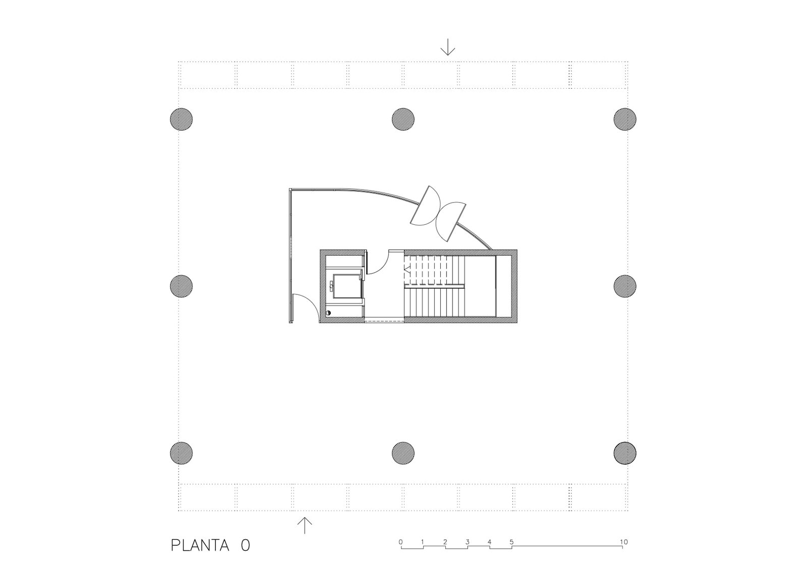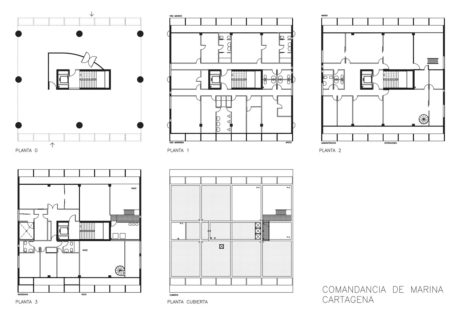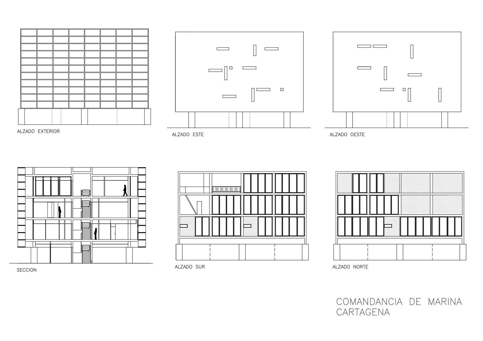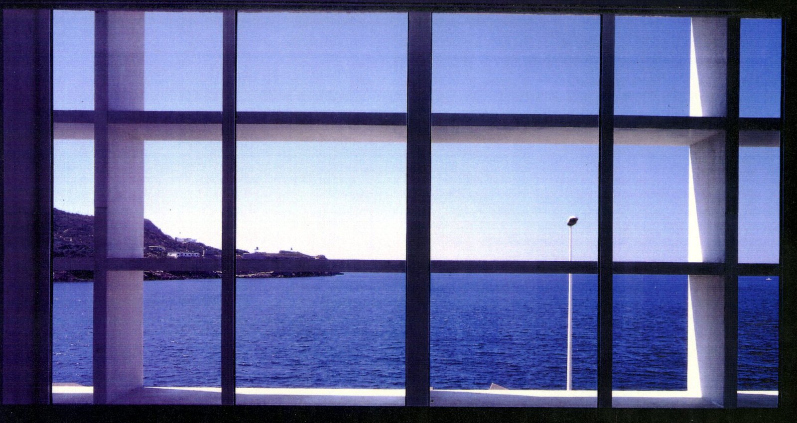 Un cubo sobre el brazo que separa el puerto del mar, un prisma de hormigón blanco 20 x 20 levantado sobre 9 pilotes PI (¢ 1 metro, perímetro p). Seis fachadas en total: cuatro verticales y dos horizontales. Dos caras de vidrio, al norte y al sur, hacia Cartagena y el Mediterráneo, resguardadas por brise-soleils. Las cuatro restantes prácticamente ciegas: las dos verticales lisas, mientras que las dos horizontales aparecen reticuladas.