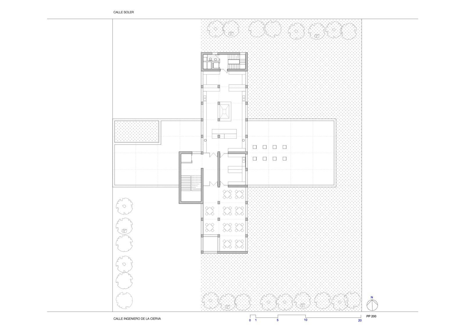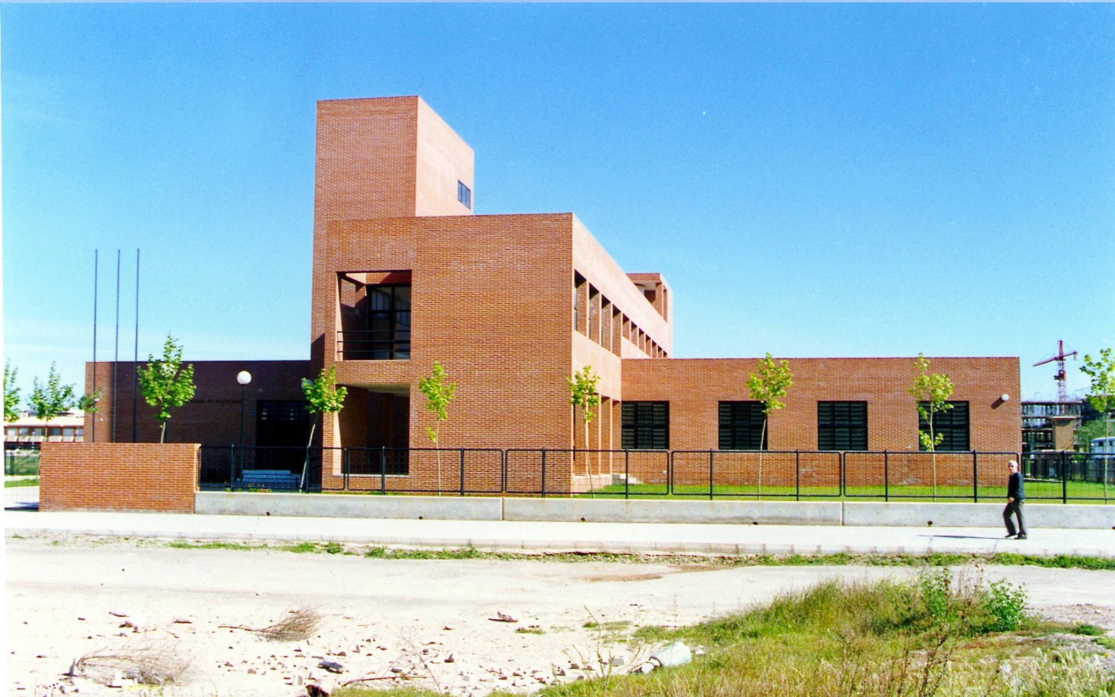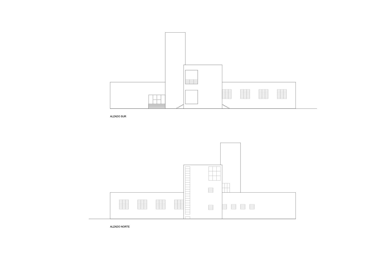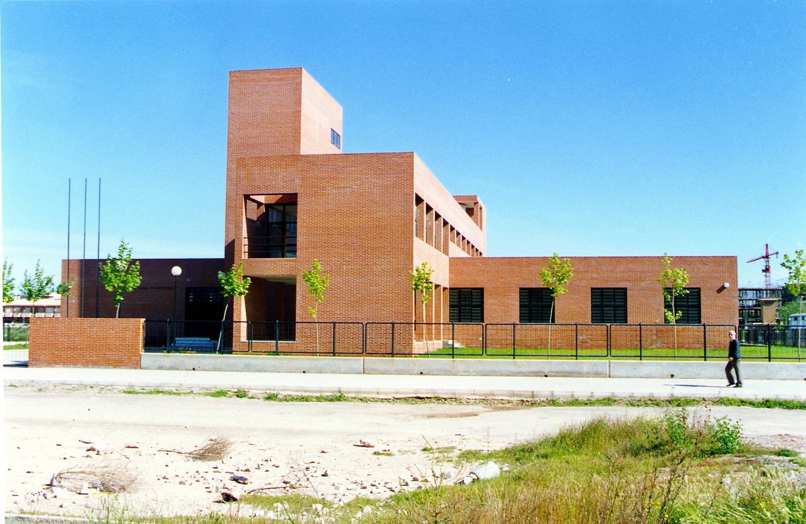Tres ejes cartesianos con tres usos: Estancias , maquinas y circulaciones. La cruz traza cuatro patios, uno delantero para acceso y otro trasero oculta servicios. La durabilidad con escaso mantenimiento, sugirió ladrillos a dos caras: de nuevo una estricta modulación. Ni un ladrillo partido