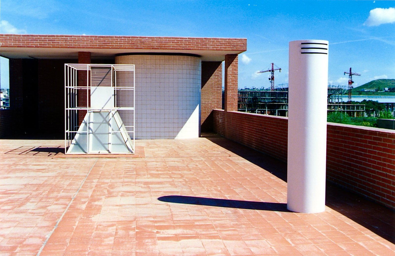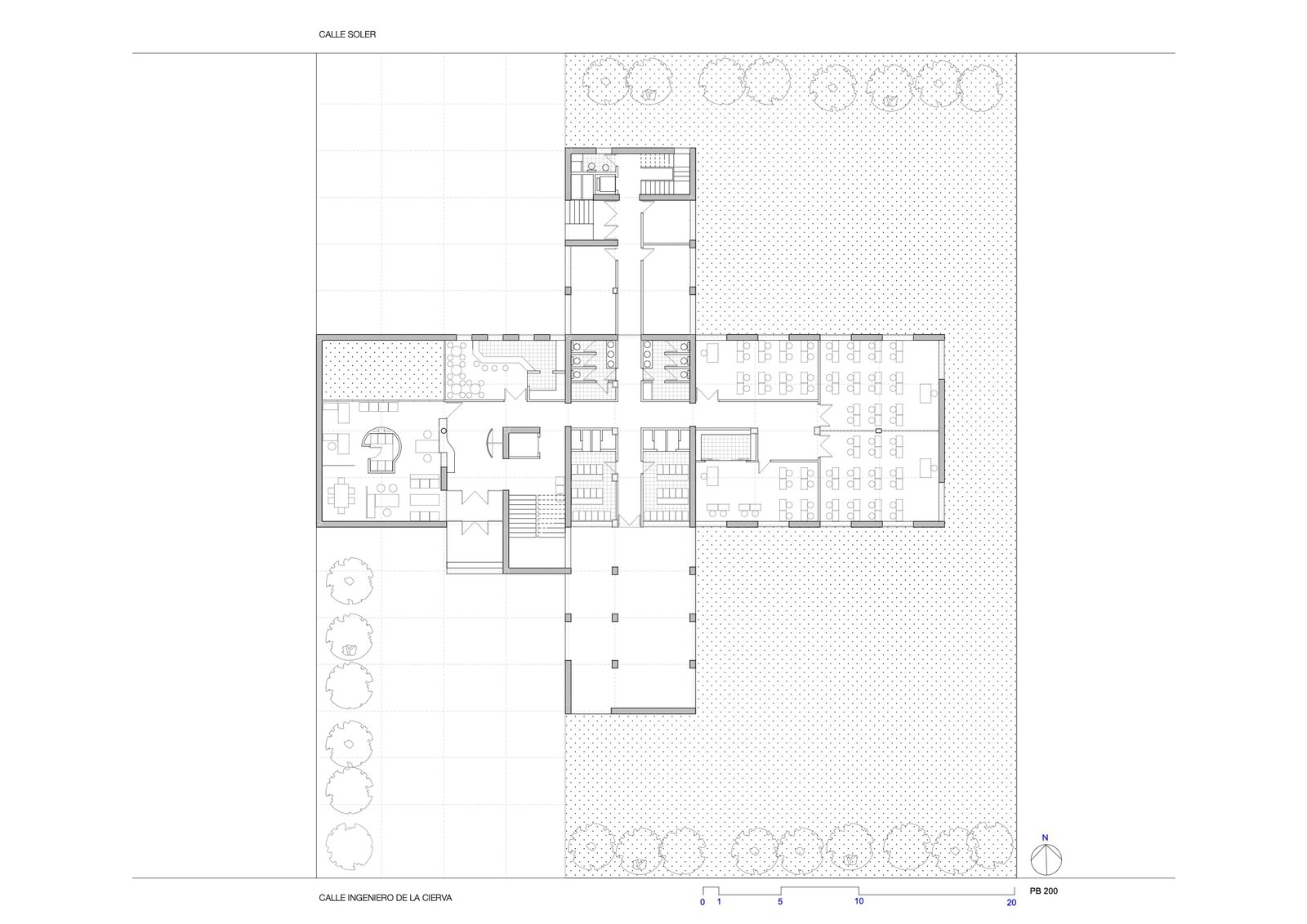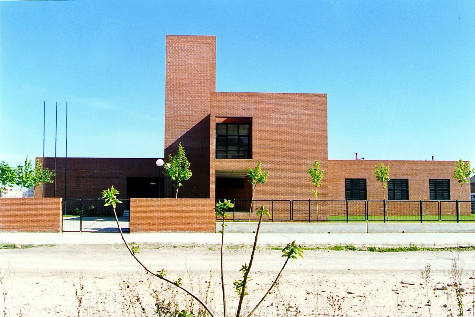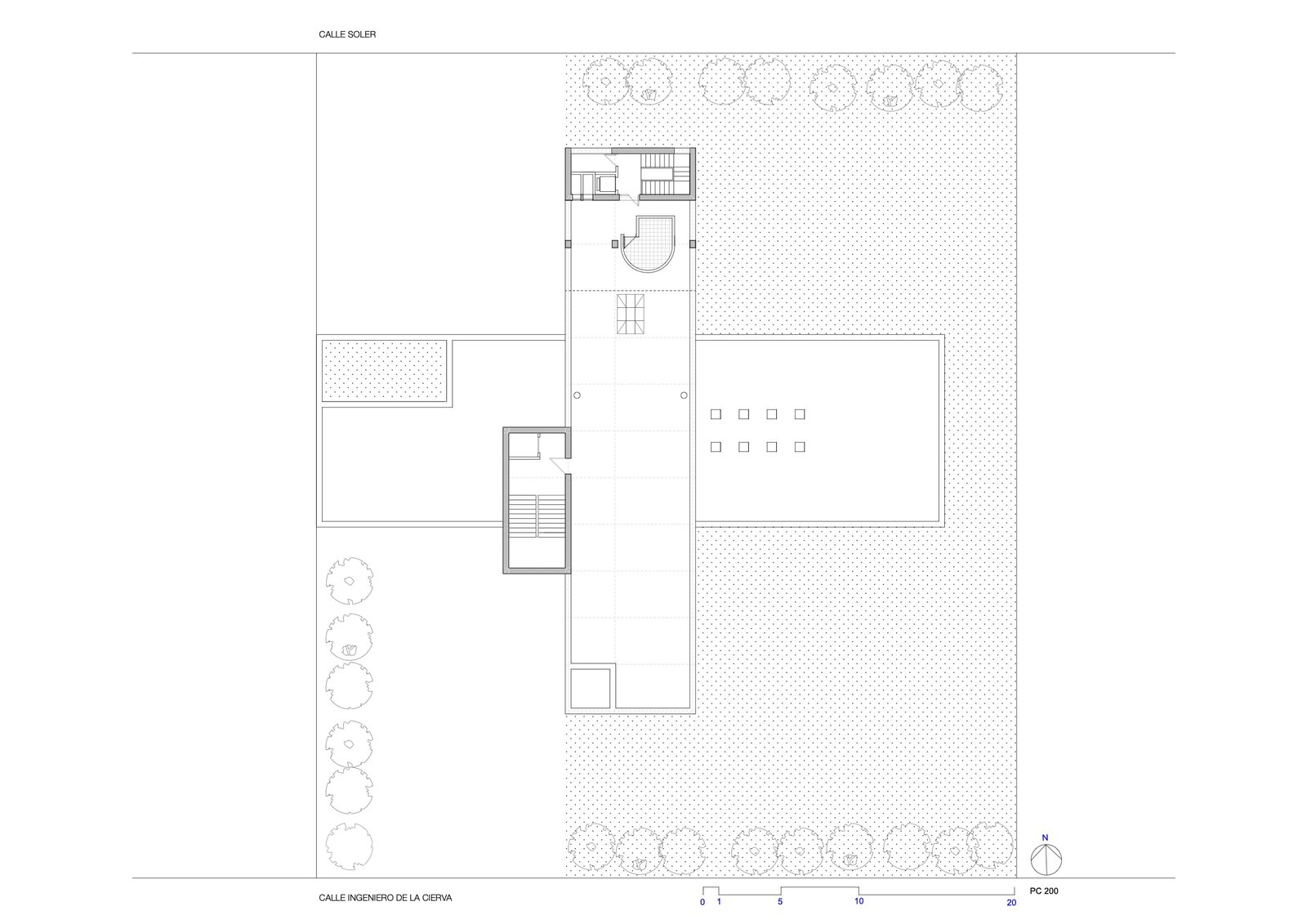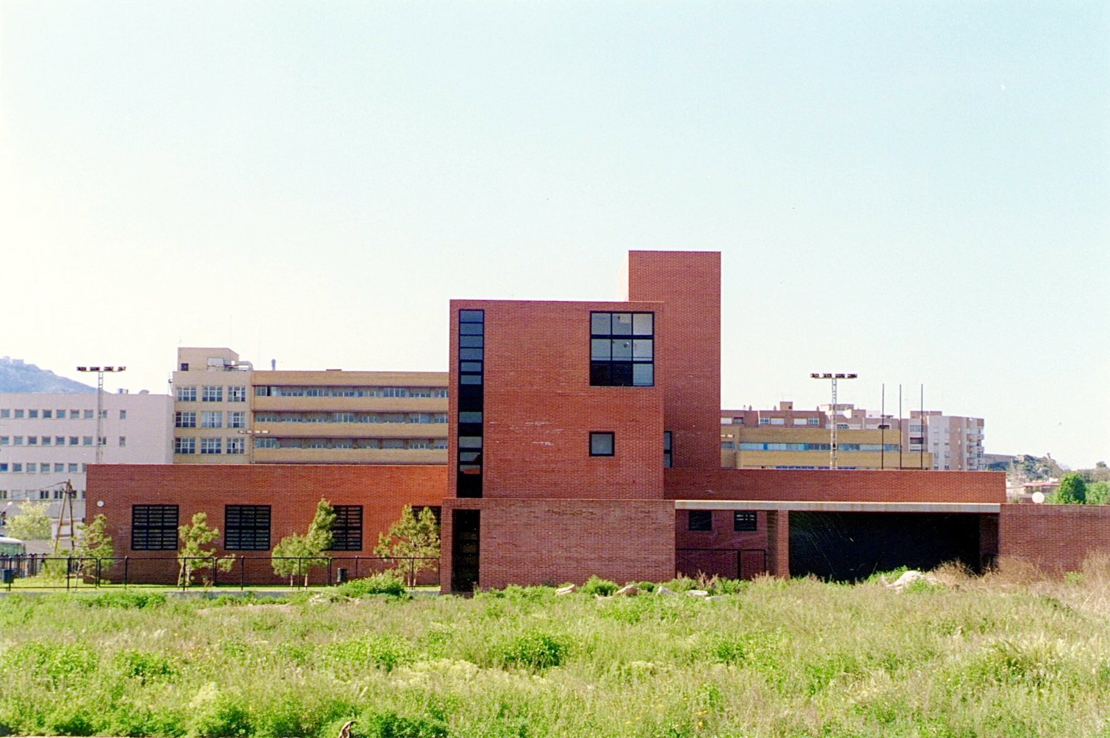 Tres ejes cartesianos con tres usos: Estancias , maquinas y circulaciones. La cruz traza cuatro patios, uno delantero para acceso y otro trasero oculta servicios. La durabilidad con escaso mantenimiento, sugirió ladrillos a dos caras: de nuevo una estricta modulación. Ni un ladrillo partido