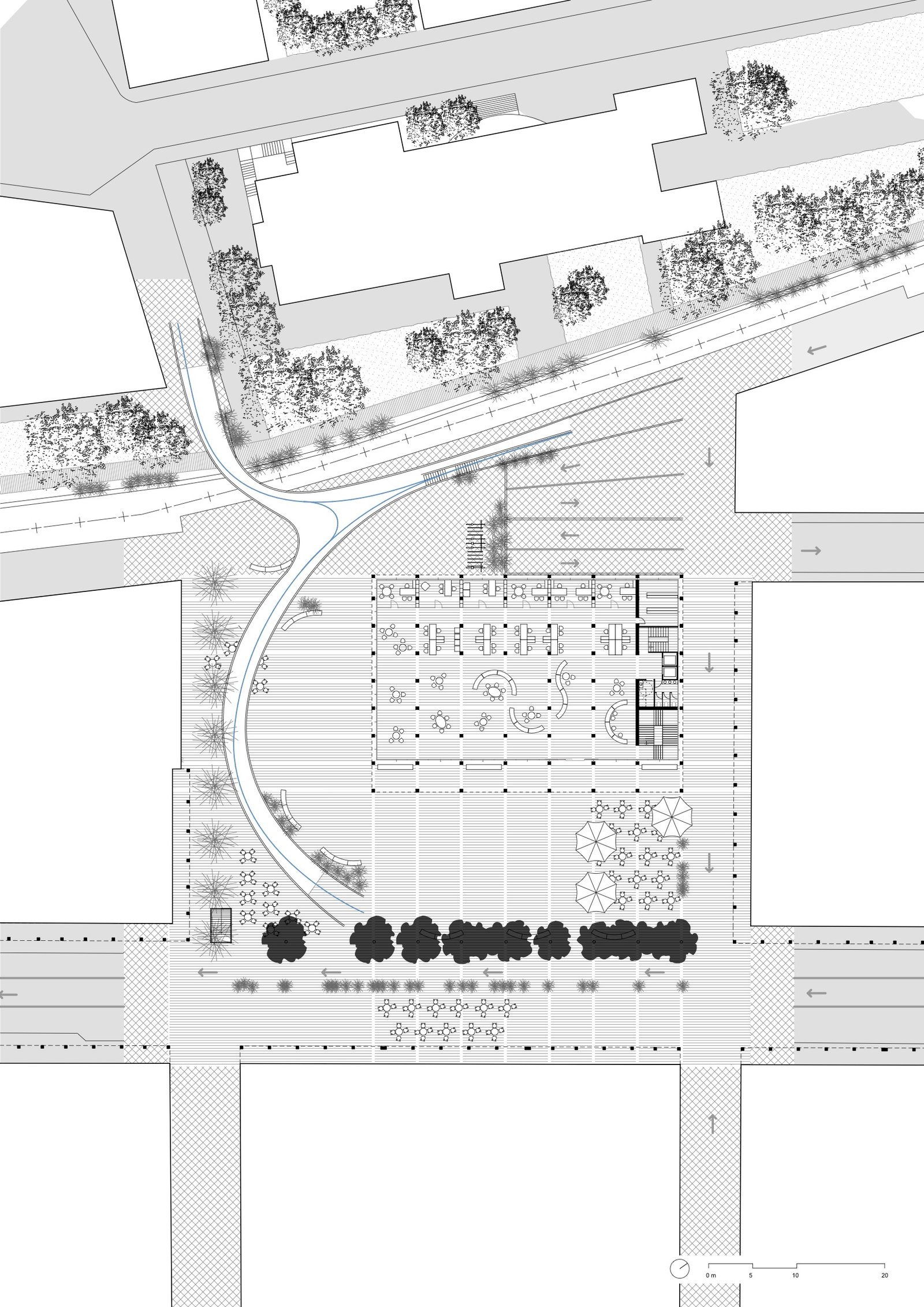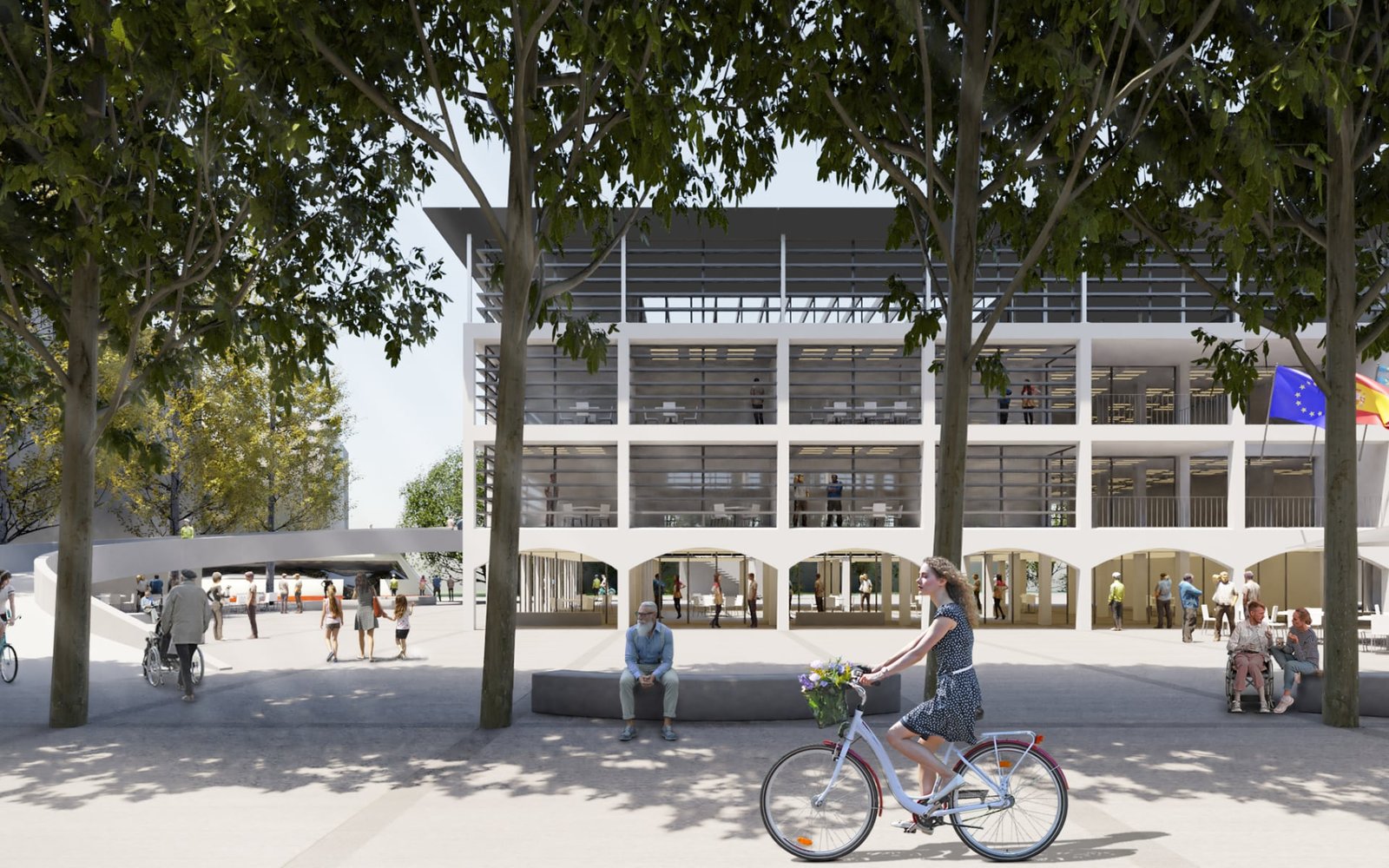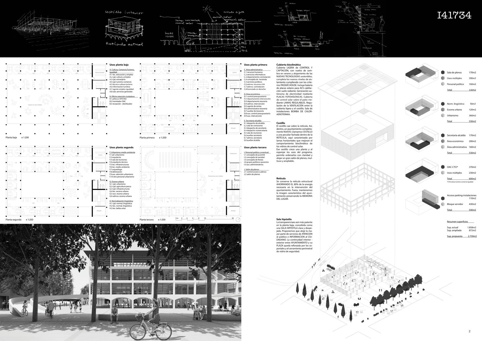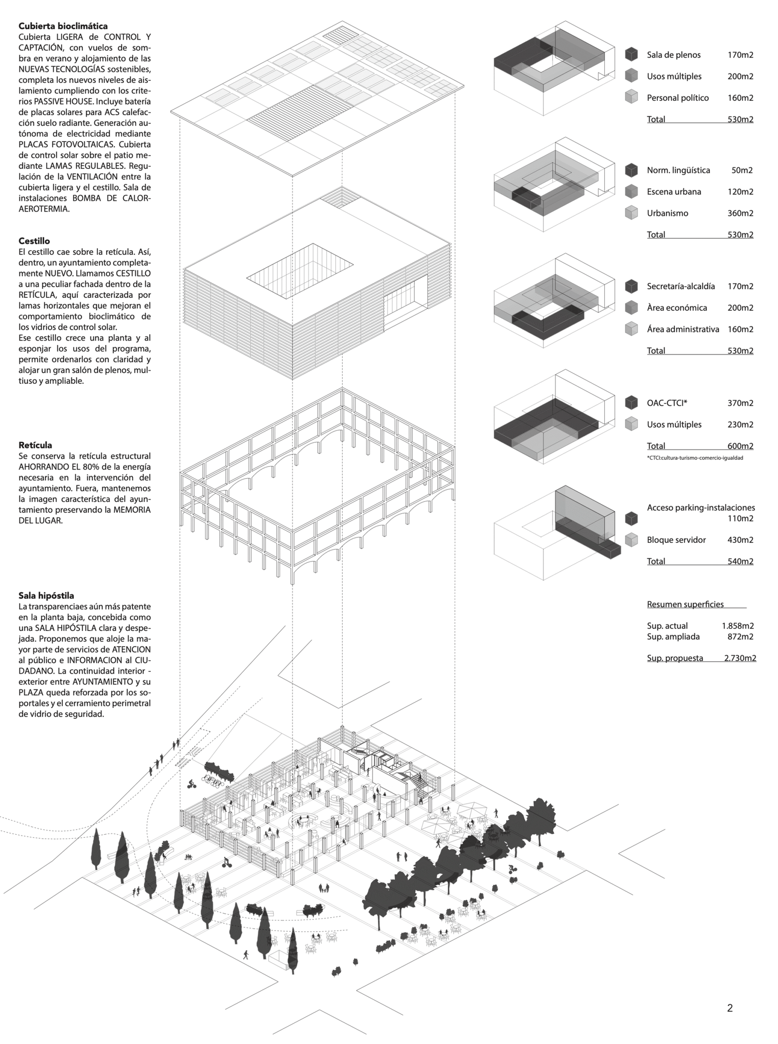 El CESTILLO cae sobre la RETÍCULA: Así, DENTRO, un Ayuntamiento completamente NUEVO. FUERA, mantenemos la imagen, la MEMORIA del lugar. Llamamos CESTILLO a una peculiar fachada dentro de la RETICULA, con lamas horizontales mejoran el comportamiento bioclimático de los vidrios de control solar. Ese cestillo sube una planta para alojar un gran salón de plenos, multiuso y ampliable.