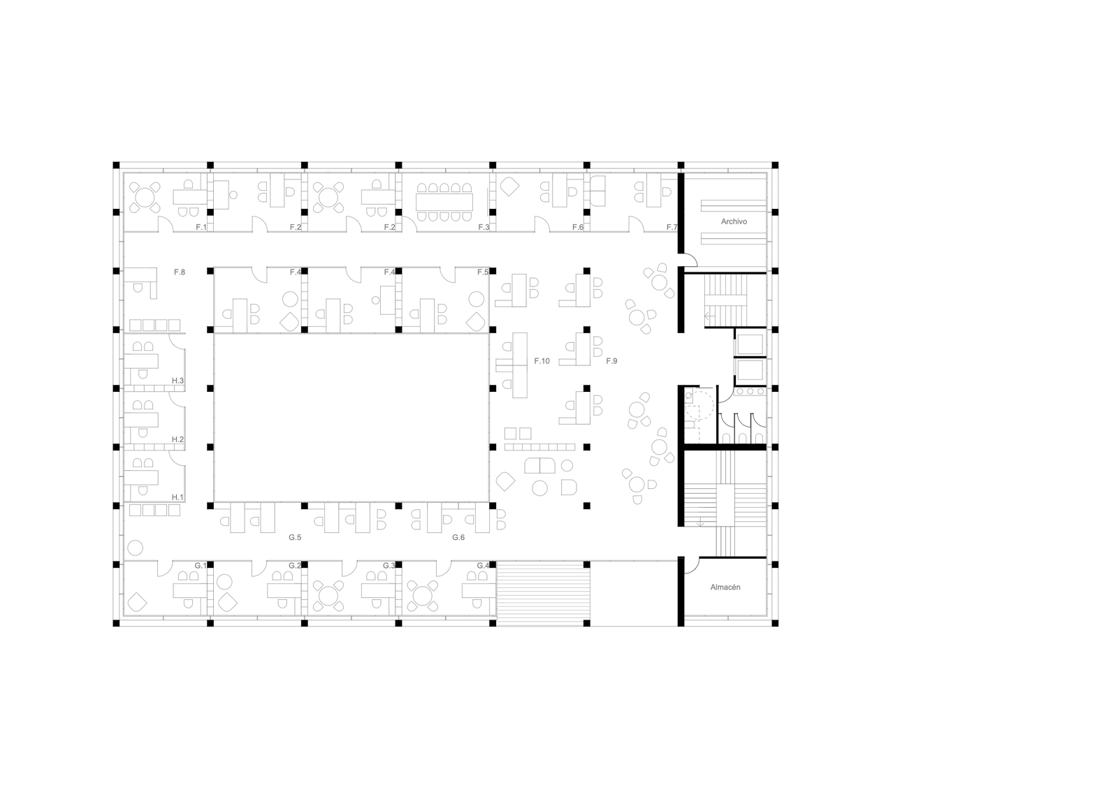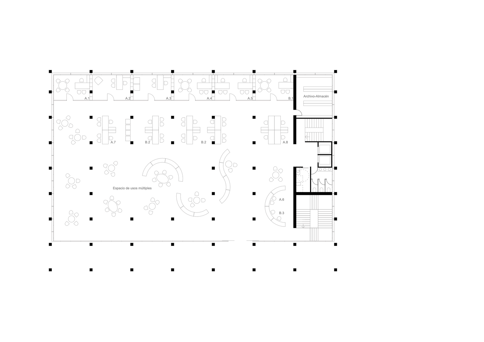 En las restantes plantas priman la CLARIDAD y FLEXIBILIDAD. En edificios administrativos lo permanente es el CAMBIO, por ello se organiza mediante PARTICIONES MODULARES con redes de instalaciones registrables por techo. Lo único rígido, la trama de pilares y el BLOQUE SERVIDOR, que ahonda en planta sótano los necesarios depósitos y permite la conexión con el APARCAMIENTO. Y un acceso alternativo al de la plaza.